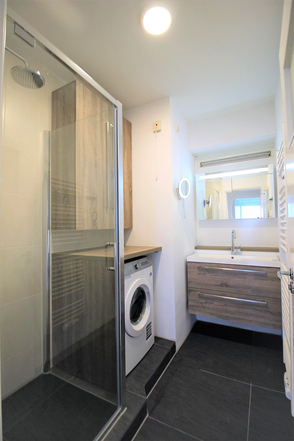 - Renovated bathroom with walk-in shower and sink