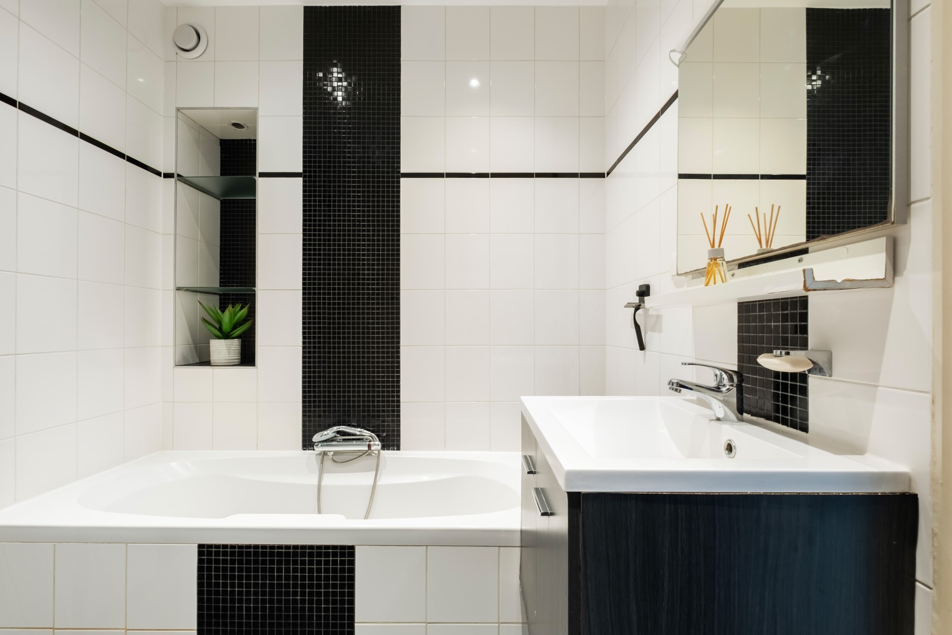 Communal entrance and staircase to the first floor: entrance/hall of the apartment with access to all rooms: bathroom with shower and bathtub, sink, and vanity. Separate toilet. Bedroom at the rear with French doors leading to the balcony. Kitchen equipped with built-in appliances, sitting area, and a door to the balcony. At the front: spacious, bright living room with French doors leading to the French balcony. Adjacent to this living room is the second well-sized bedroom.