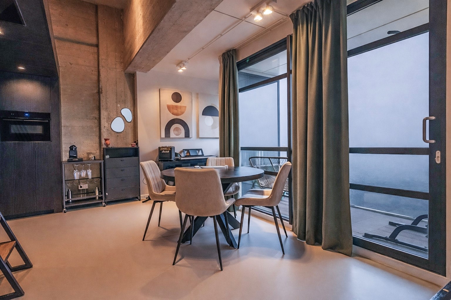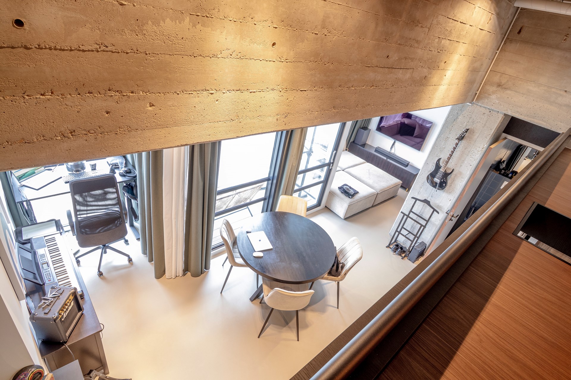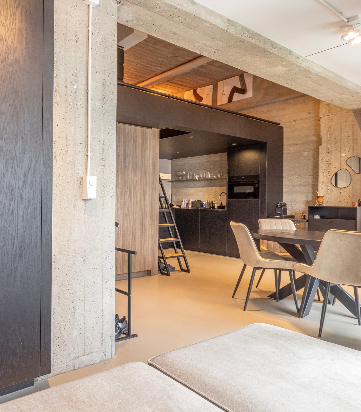 Industrial elements blend seamlessly with modern comfort. A strong emphasis has been placed on custom-made details: from the kitchen to the fixed staircase and the mezzanine, everything has been carefully designed and executed. The apartment is equipped with underfloor heating combined with a concrete-look floor, sound-insulating thermal windows, large sliding doors leading to the balcony, JUNG switches, and high-end lighting. In addition, the apartment features a CO₂-controlled ventilation system and private solar panels. The property has an energy label B.