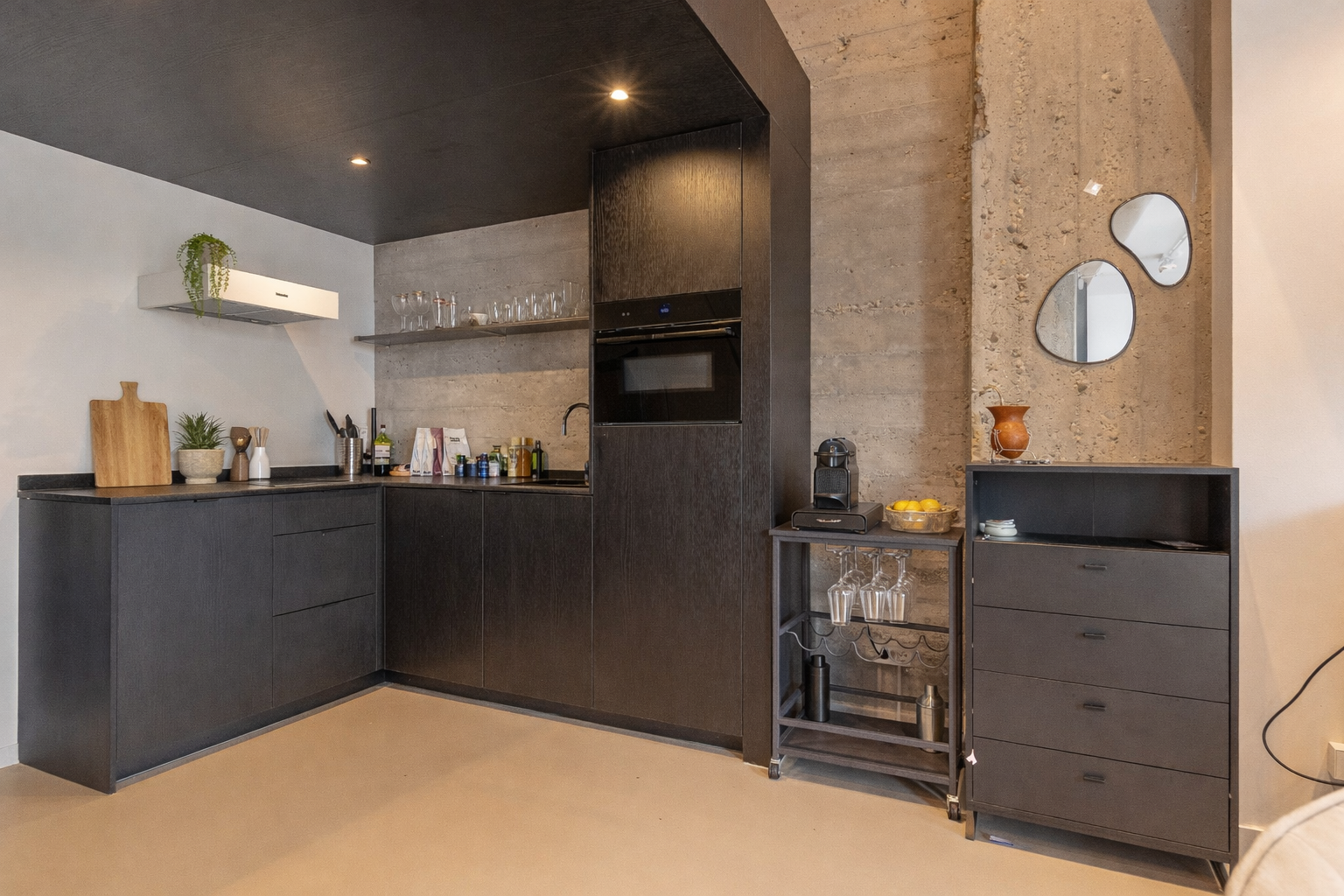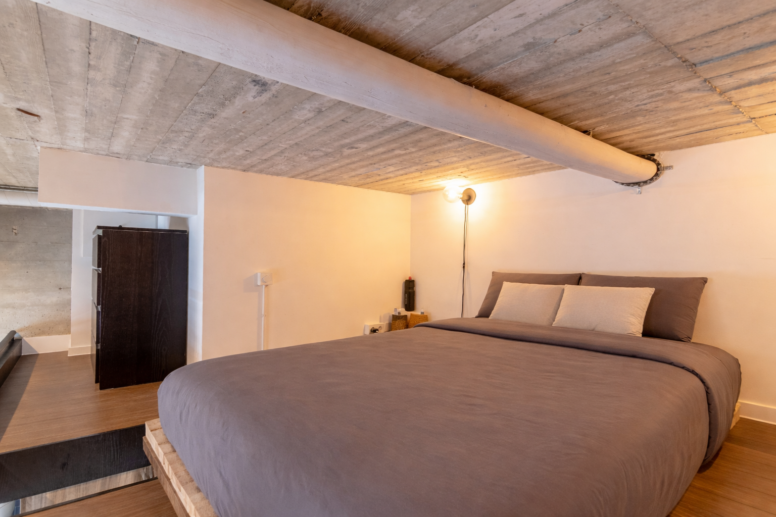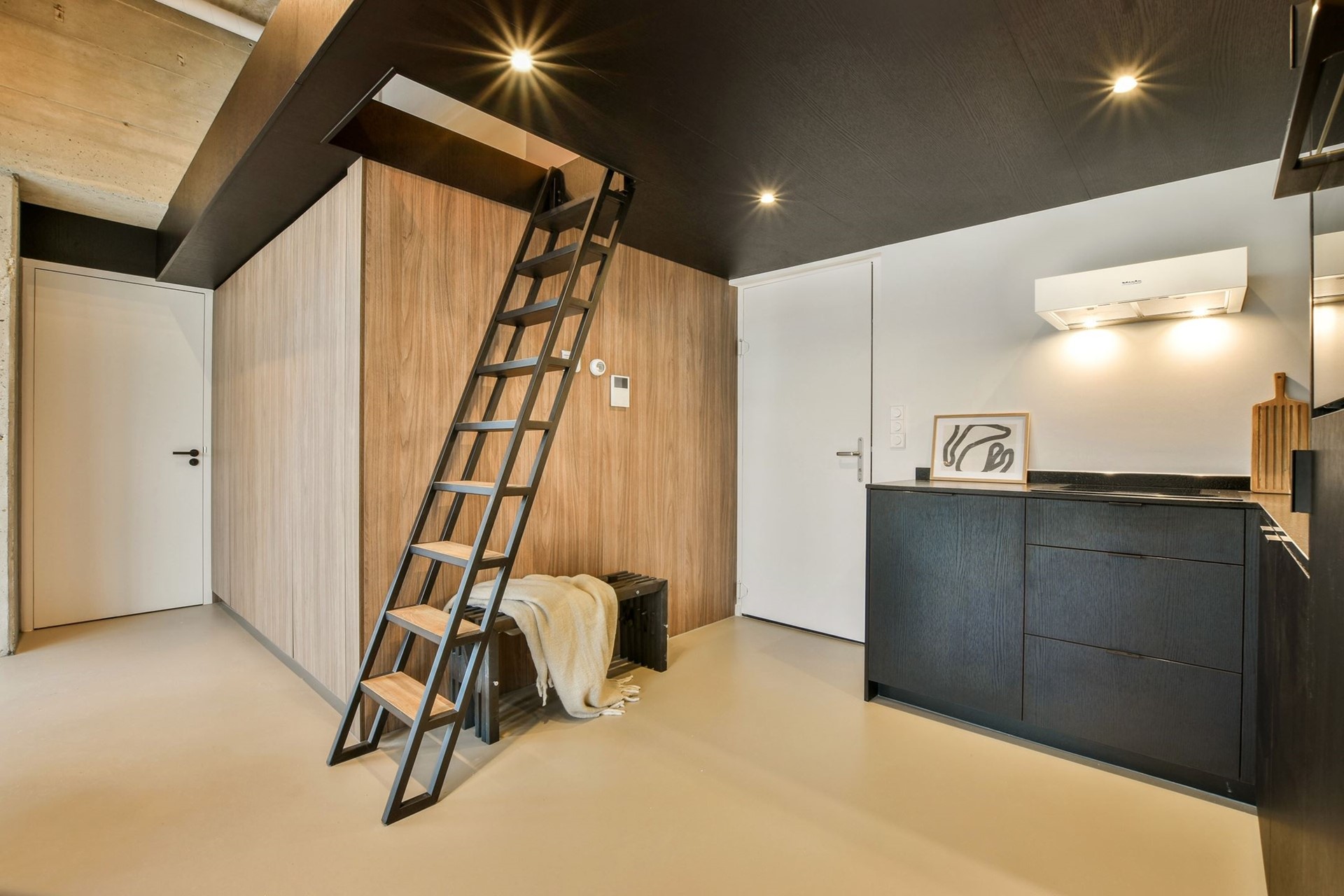Industrial elements blend seamlessly with modern comfort. A strong emphasis has been placed on custom-made details: from the kitchen to the fixed staircase and the mezzanine, everything has been carefully designed and executed. The apartment is equipped with underfloor heating combined with a concrete-look floor, sound-insulating thermal windows, large sliding doors leading to the balcony, JUNG switches, and high-end lighting. In addition, the apartment features a CO₂-controlled ventilation system and private solar panels. The property has an energy label B.