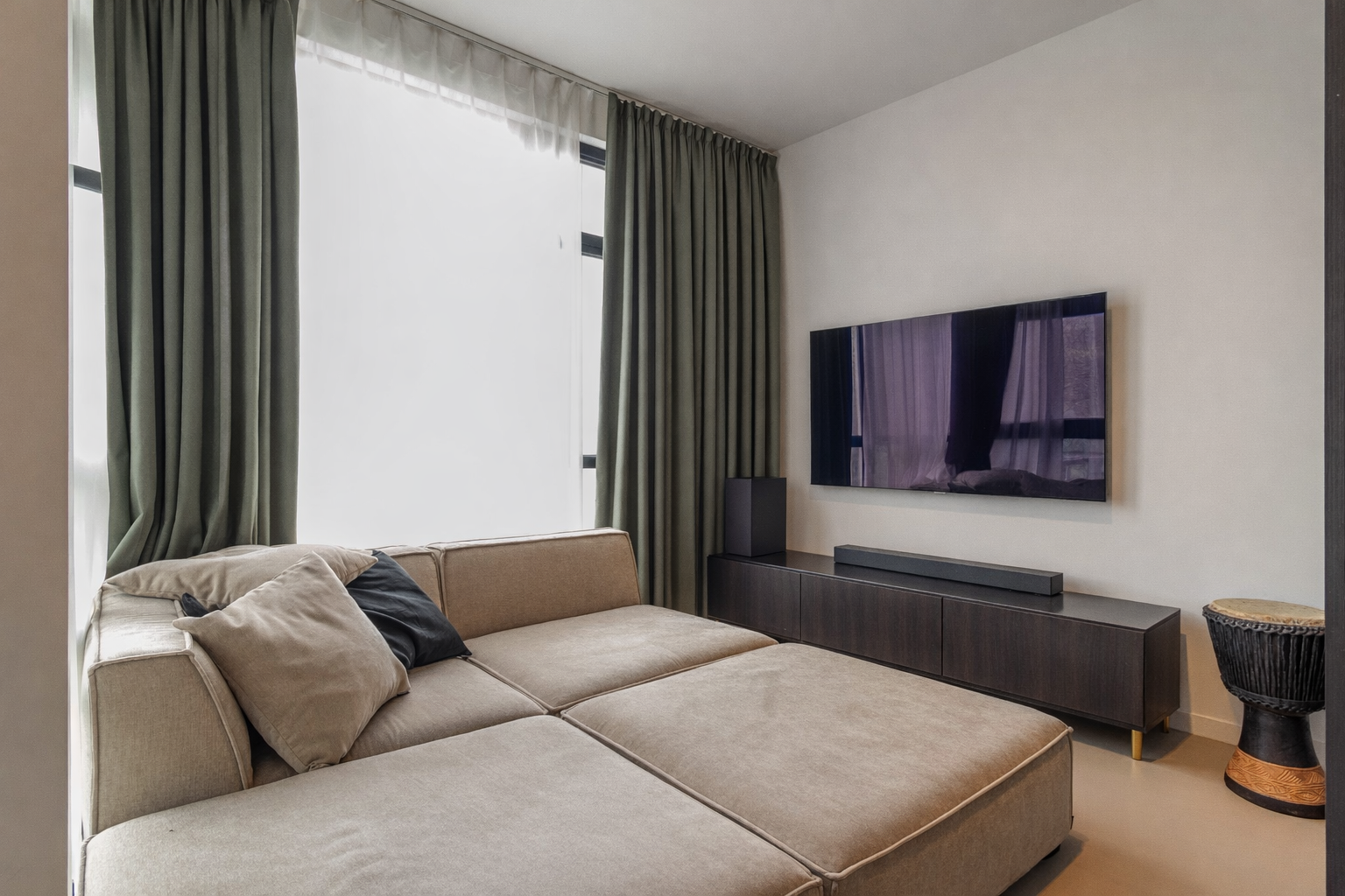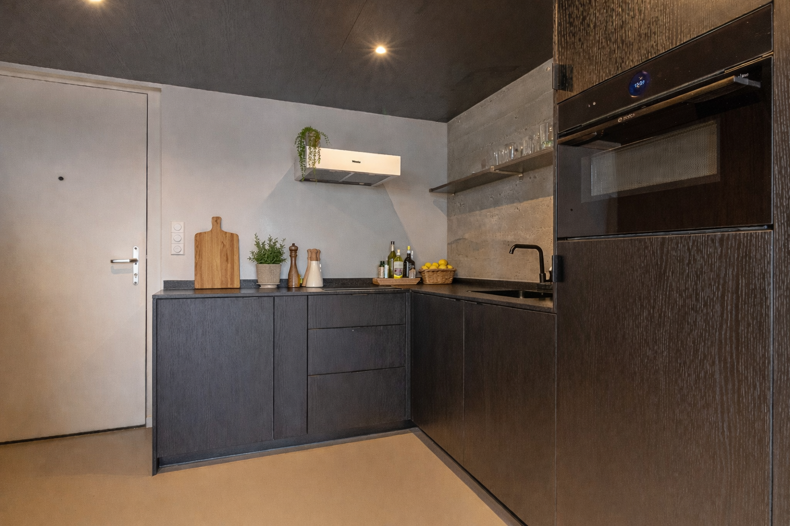 The living area forms the heart of the home and immediately stands out for its high ceilings and large windows. The open-plan kitchen is finished in black oak veneer and equipped with high-quality built-in Bosch appliances, a Miele hood, and a Quooker instant boiling water tap. The adjacent dining area provides access to the east-facing balcony through large sliding doors.