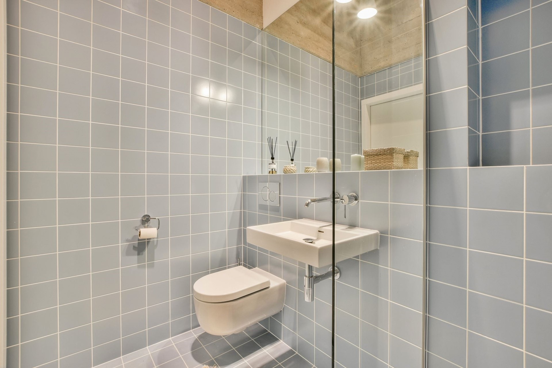 The modern bathroom features a walk-in shower with a rain shower, a neat washbasin, and a wall-hung toilet. The washing machine connection and electric boiler are neatly concealed in a built-in storage cabinet.