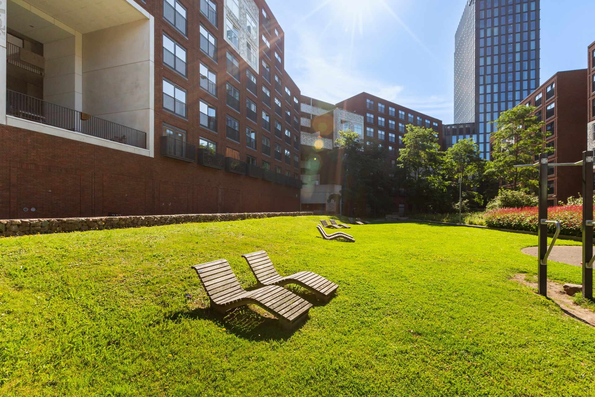 This luxurious new-build complex, built in 2014, features a communal courtyard garden, several roof terraces, two elevators, and convenient bicycle storage. Due to its location, the apartment is very sunny and bright, with a beautiful view of the courtyard garden. So, NOT on the side of the railway line!