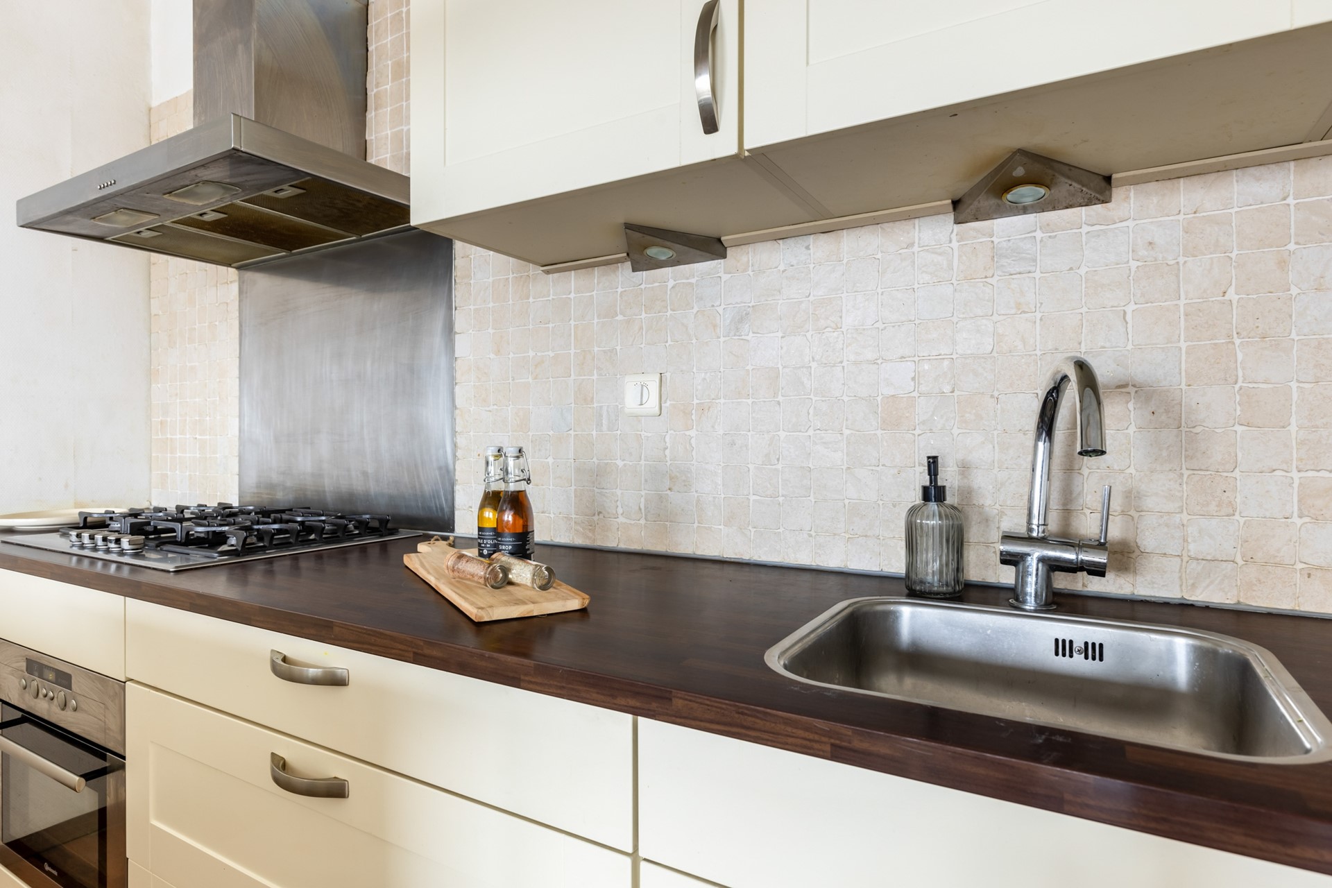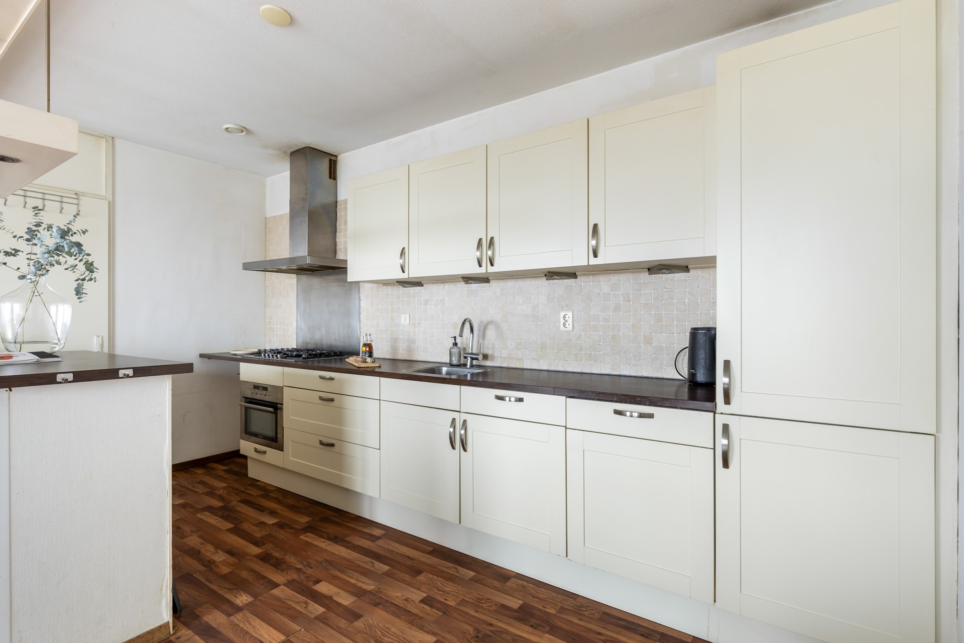 De woonkamer is licht en ruim en staat in open verbinding met de keuken. Via openslaande deuren is het balkon bereikbaar, gelegen op het zuidwesten en van een prettig formaat. De keuken is uitgerust met diverse inbouwapparatuur, waaronder een gasfornuis met afzuigkap, oven, vaatwasser en koel-vriescombinatie, en biedt veel kastruimte.